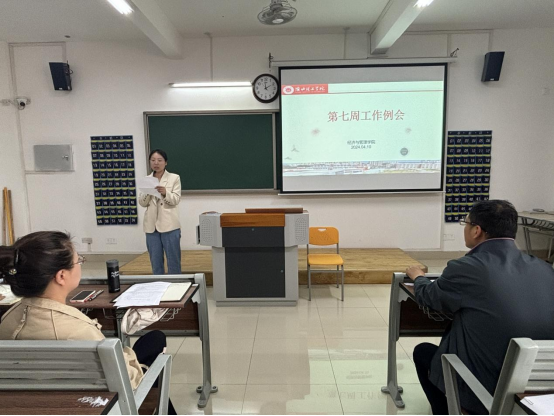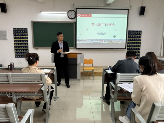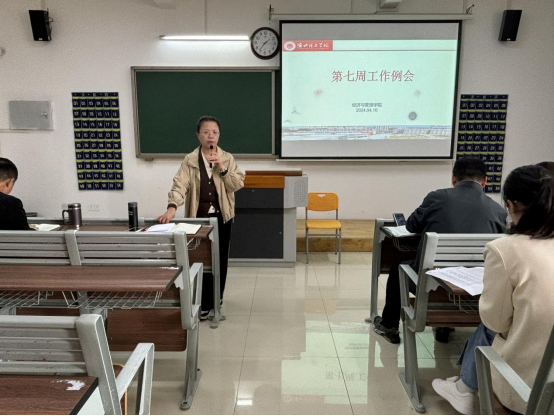 2024年4月10日下午,bat365正版唯一官网在一教213召开bat365正版唯一官网第七周工作例会,院长吴玲主持会议,副院长秦品德、院长助理张珊以及全体教师参会。