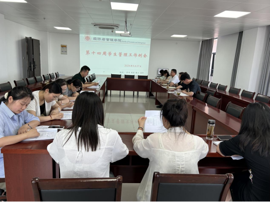 2024年5月27日,bat365正版唯一官网在行政楼725会议室召开本学期第十四周学生管理工作例会,副院长秦品德、院长助理张珊、书记助理叶赵强以及全体辅导员参加会议,会议由院长吴玲主持。