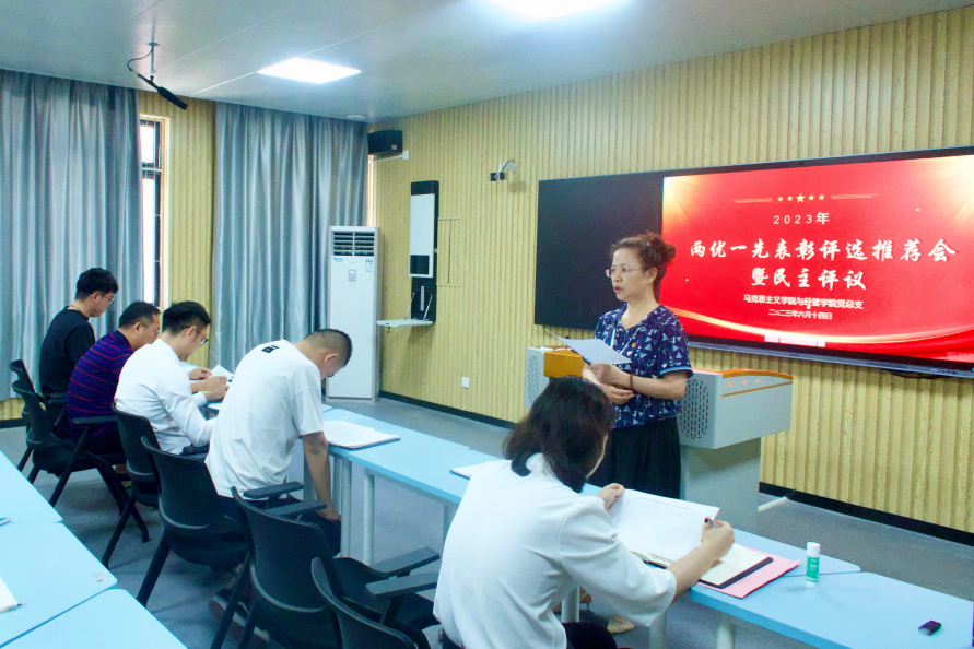 根据学校党委《关于开展2023年“先进基层党组织、优秀共产党员、优秀党务工作者”评选表彰活动的通知》精神,6月14日下午,马克思主义学院与经济管理学院党总支组织召开“两优一先”表彰评选推荐会暨民主评议党员活动,总支书记吴玲主持会议,两个学院的全体党员教师参会。