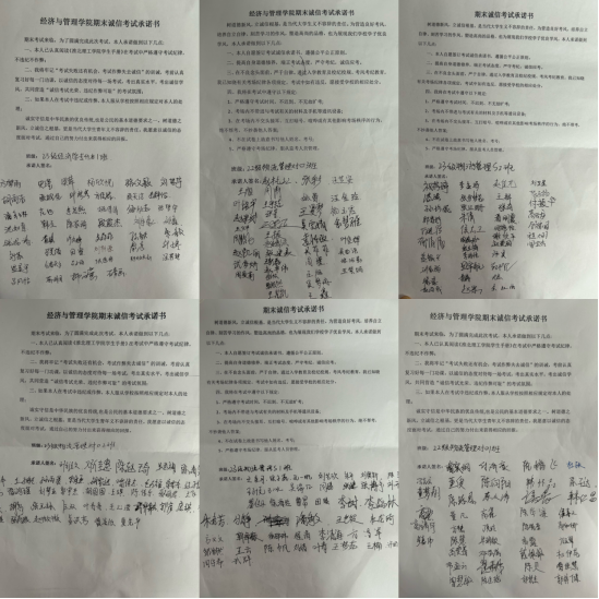 各年级辅导员通过召开诚信考试主题班会,强调了诚信考试的重要性与考试作弊的严重后果,带领同学们共同学习<<bat365正版唯一官网学生手册>>学生违纪处理办法第二十五条考试相关规定,引导同学们认真复习,警示大家要防微杜渐,预防和遏制作弊、受处分现象发生,并让学们签署了诚信考试承诺书,形成“我诚信-我自豪,诚信考试”的良好氛围。