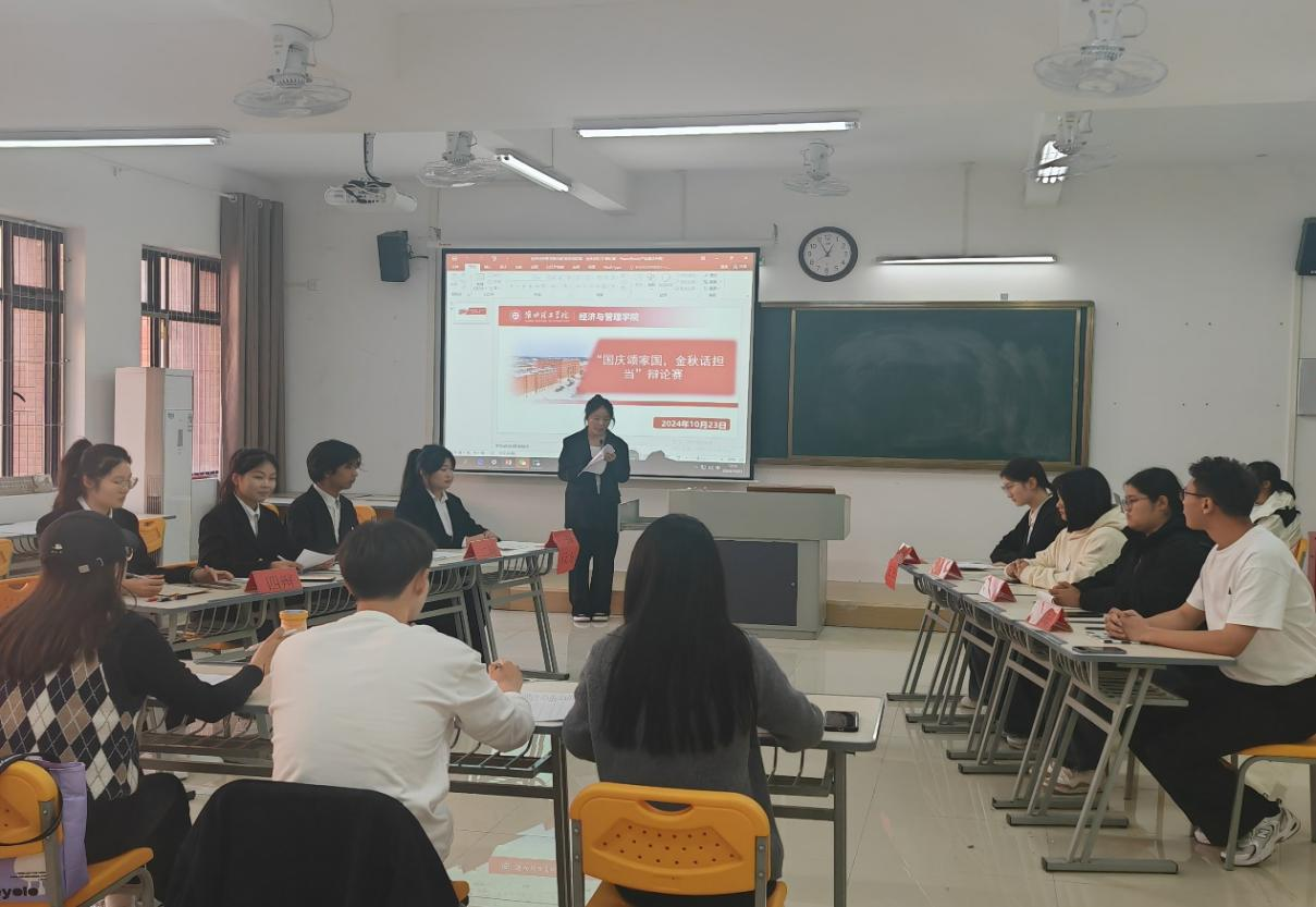 为进一步丰富大学生校园生活,引领大学生树立正确的世界观,人生观和价值观,激发学生热情,培养学生合作精神。2024年10月23日下午,bat365正版唯一官网组织了一场以“国庆颂家国,金秋话担当”为主题的辩论赛活动。由学生自愿组成的20支队伍进行比赛,分为两个赛场同时进行。本次活动由学习部成员主持,由学院辅导员老师担任评委。