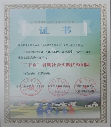 近日,六安市“乡约皋地 淬炼青春”大学生暑期社会实践活动评选结果公布,bat365bat365正版唯一官网赴六安“直播促进乡村振兴”暑期社会实践团队凭借突出的实践成果和扎实的工作作风,荣获“优秀团队”荣誉称号。