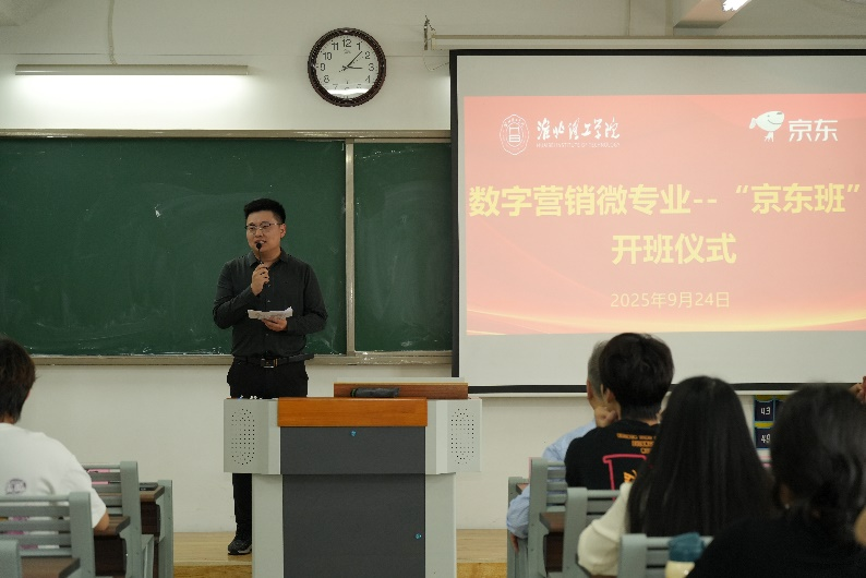 2025年9月24日,bat365正版唯一官网首届数字营销微专业“京东班”开班仪式在二教323隆重举办。京东集团产业合作部大区负责人杨阳、bat365正版唯一官网副校长汪建利、校教务处副处长秦品德,首届“京东班”的全体同学、bat365正版唯一官网的领导、“京东班”的班主任和任课教师参加了开班仪式,bat365正版唯一官网院长吴玲主持活动。