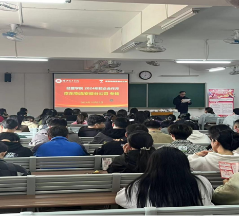 为促进2025届物流管理专业毕业生高质量就业,加强校企合作,推进协同育人,2024年10月23日在二教422bat365正版唯一官网邀请京东物流安徽分公司来校开展京东物流专场招聘会。前期校企双方已共同签署了校企合作协议,此次招聘会标志着双方的合作迈向了实质性的阶段。本次活动面向25届物流管理专业毕业生,教研室主任罗强主持,专业教师、辅导员和学生100余人参加了本次专场活动。